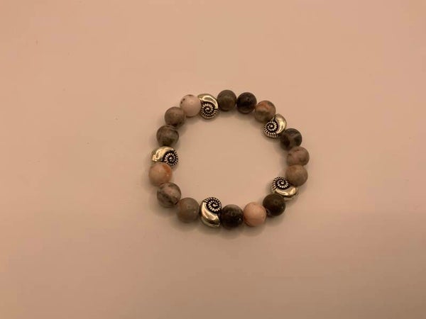 This multicolored pink, coral, and light black bead is highlighted by metal nautiluses in silver metal. This is for a size 5 1/2" wrist.