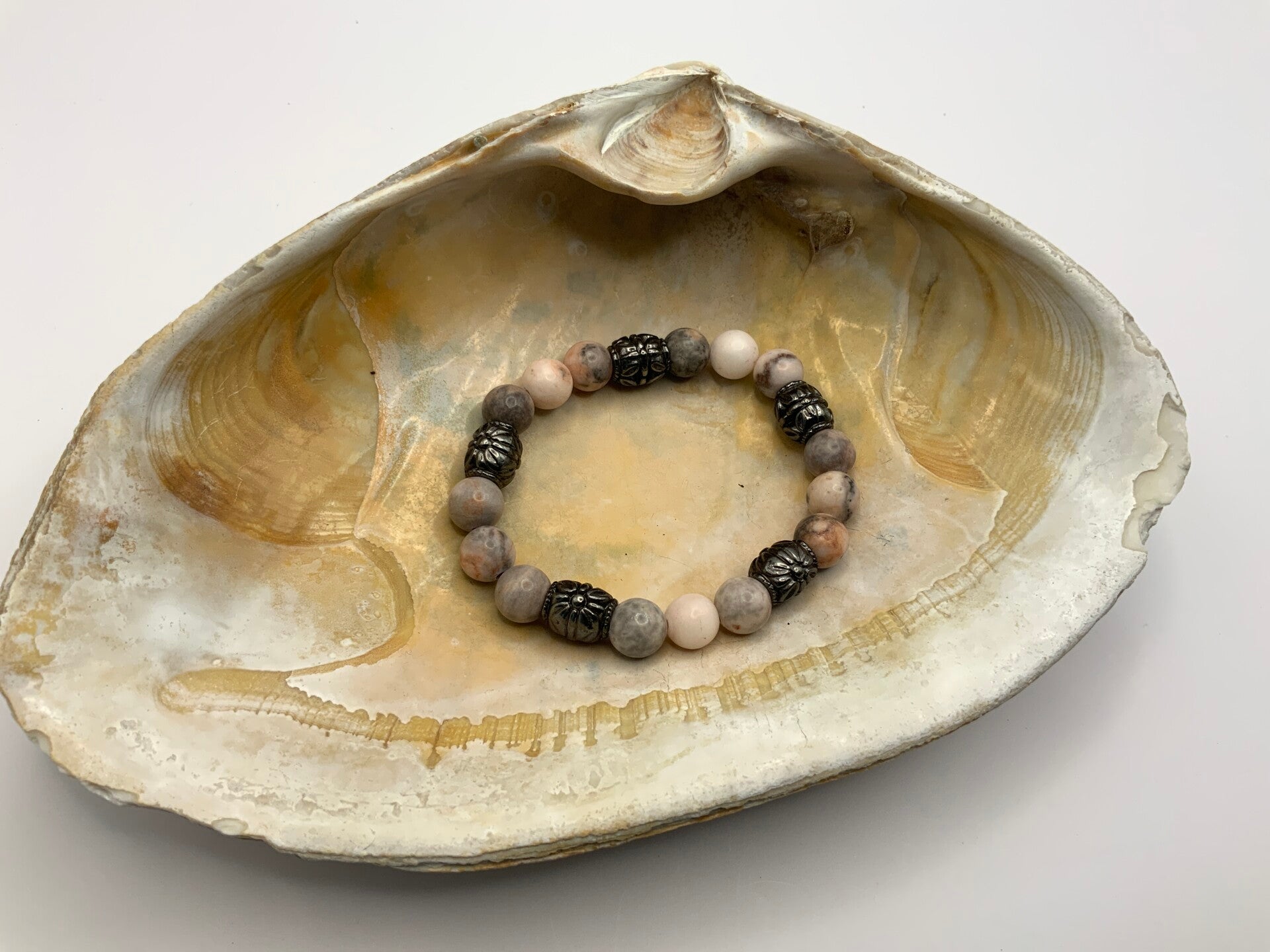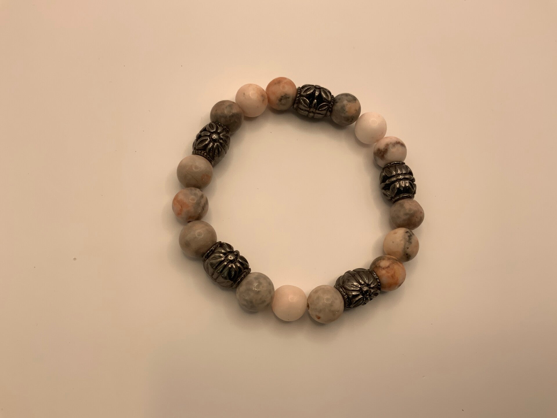 This beautiful multicolored stone in shades of pink, coral, and gray are highlighted by black metal barreled spacers. This is for a size 6 wrist.