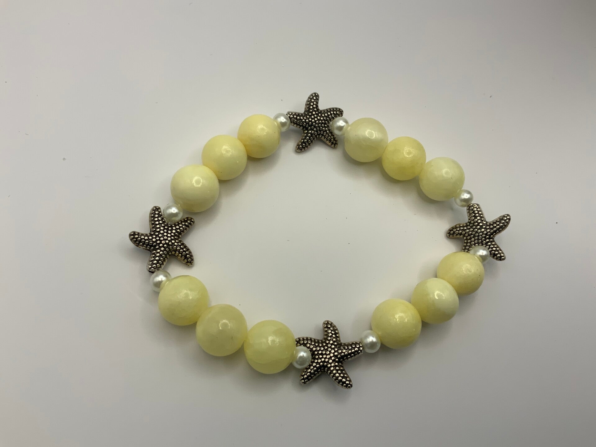 Are you a summer lover? If your answer is yes then you need this bracelet. This fun bracelet features soft yellow beads flanked by antigue metal starfish flanked by two faux pearls. This bracelet is for a size 6 1/2" wrist.