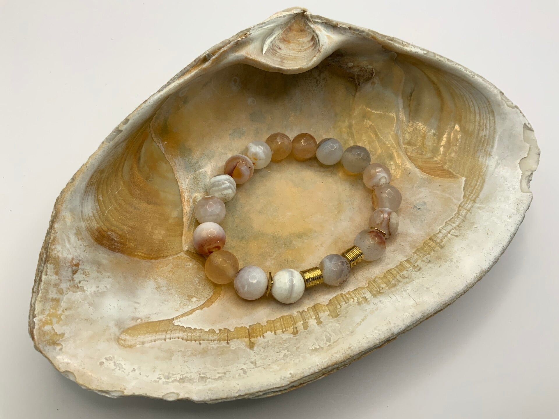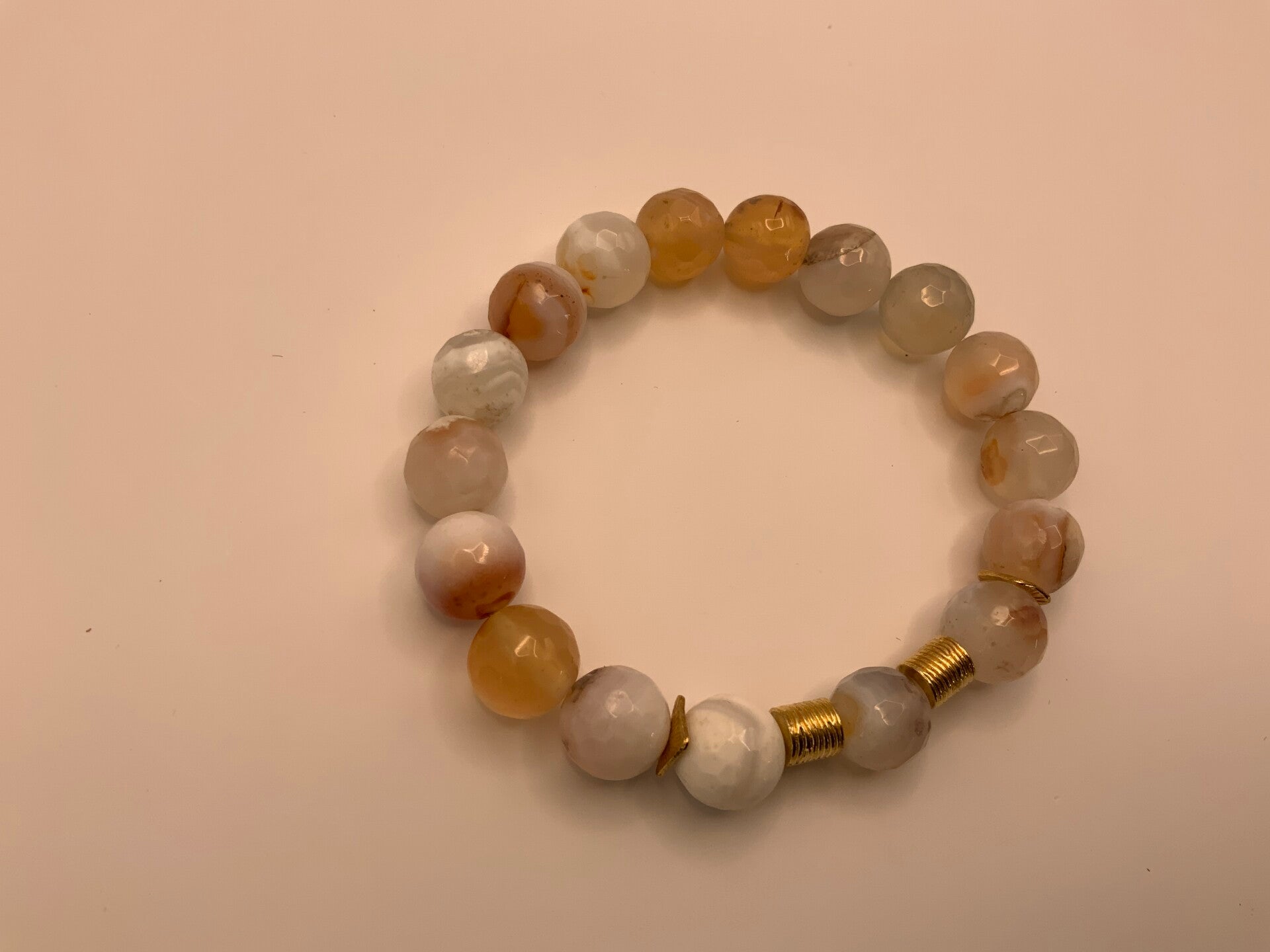 This beautiful bracelet reminds you of a walk on a Sandy beach. These beautiful agate beads are highlighted in front by 4 gold spacers. This neutral color will work with anything you wear. This is for a size 6 1/2" wrist.