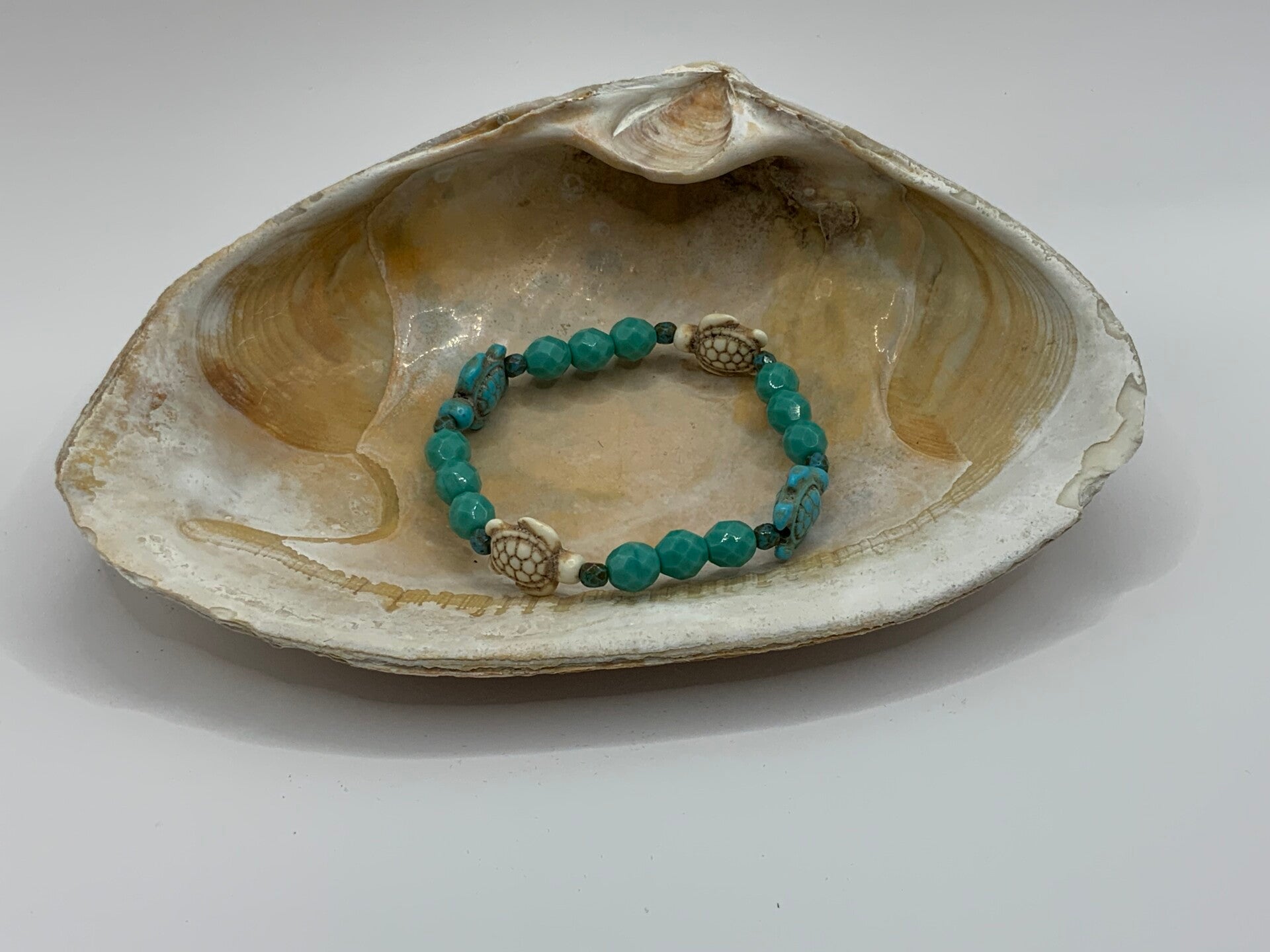 This adorable turtle bracelet features alternating antique white and antique blue swimming turtles. These turtles are highlighted with tourquoise colored beads in 2 sizes. This is made for a size 6 1/2" wrist.