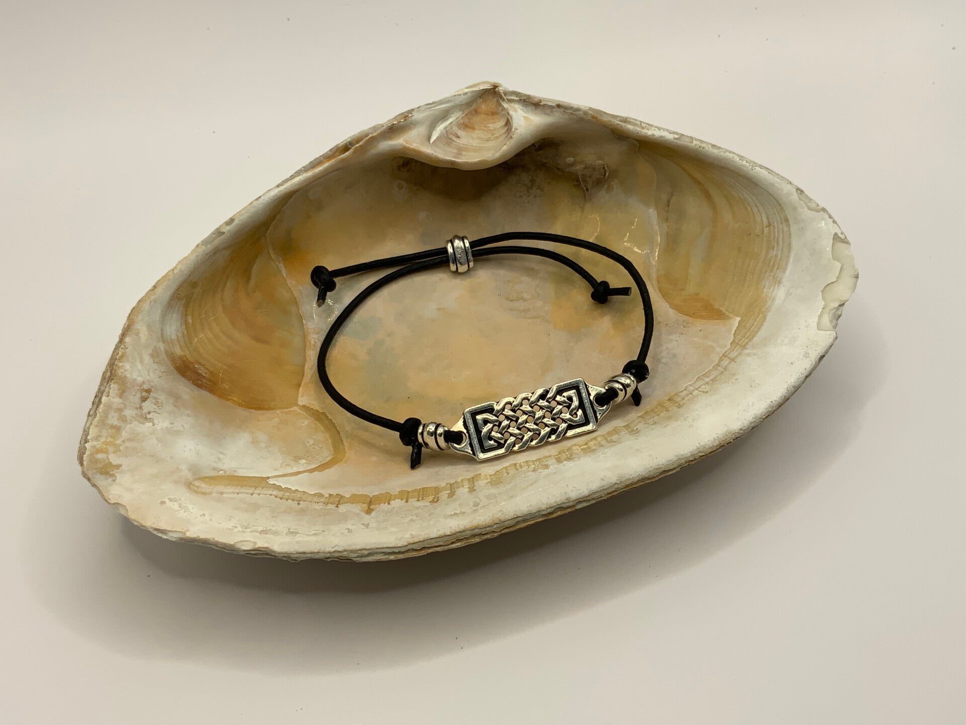 Rock that Irish side with this beautiful adjustable leather Celtic bracelet. Wear it alone or use it as a stacker bracelet. This fits up to a size 9 wrist.