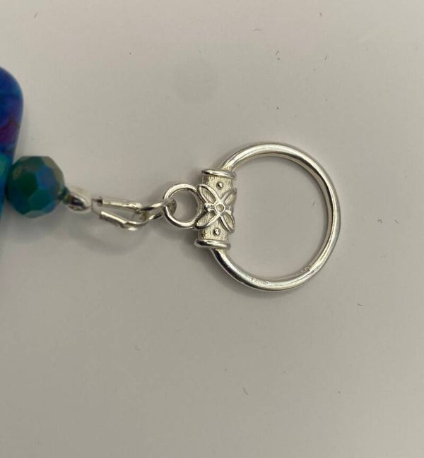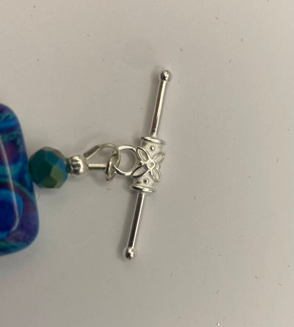 This gorgeous bracelet features a sterling silver toggle closure. The beads are very unique and remind one of peacock feathers. Crystals are placed between each bead to highlight the colors in the bead. This bracelet is not meant to be tight and will be just the right circumference for a size 7 wrist.