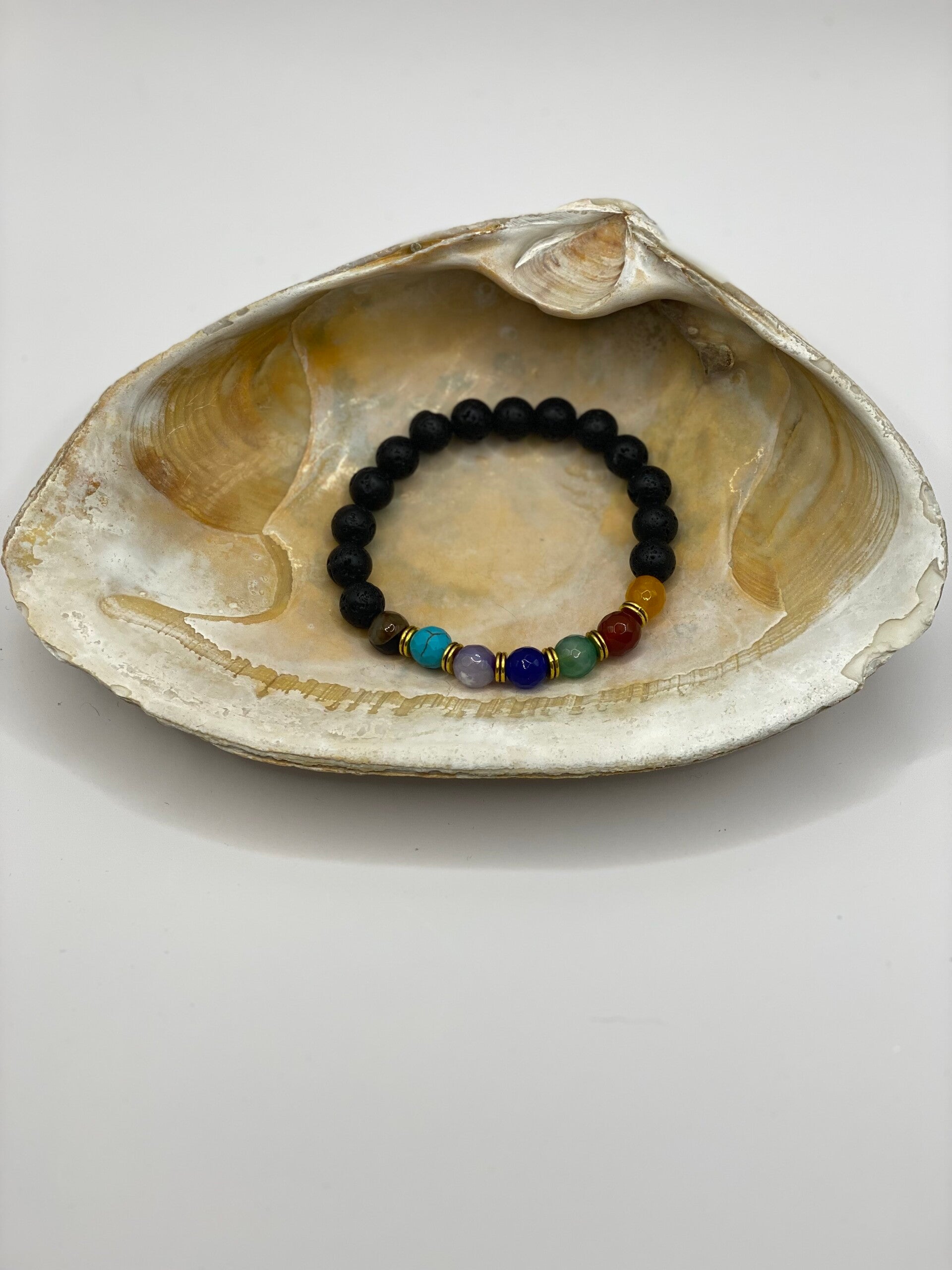 This bracelet is made with black lava beads and features multi colored glass beads highlighted with metal spacers. This bracelet is made for a size 6 1/2" wrist.