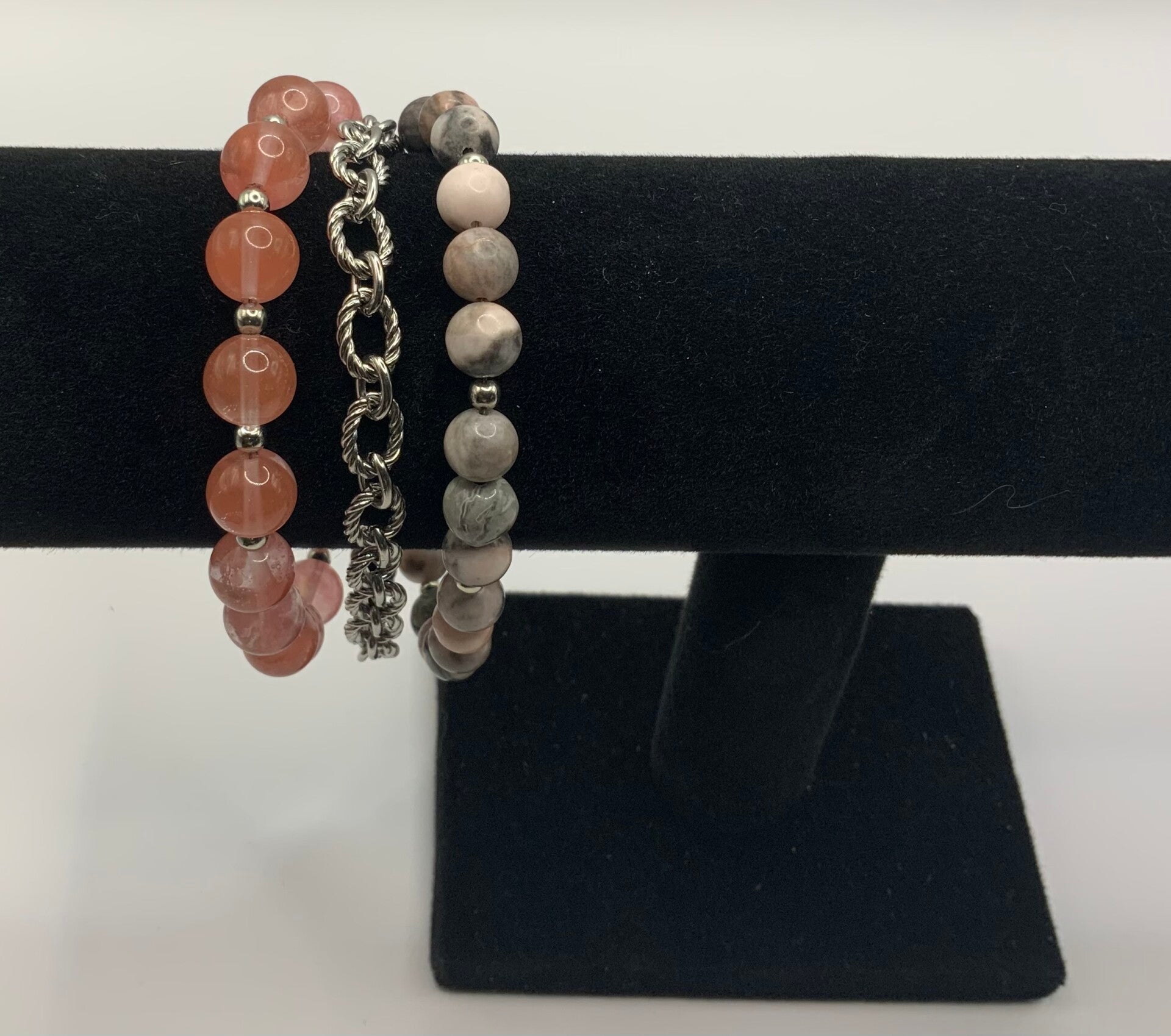 This 3 stranded bracelet is quite stunning. Why buy 3 bracelets when you can just buy one. The first strand has coral colored glass beads accented with metal spacers. The second strand is an embossed stainless steel chain. The third strand features African Zebra Jasper with metal spacers. This is for a size 7 wrist.