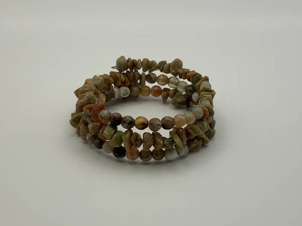 This 3 strand memory bracelet features natural stone beads that are highlighted with coordinated polished beads. It feels so comfortable on the wrist. If you like the look of multiple bracelets on one wrist then this is a "must have".