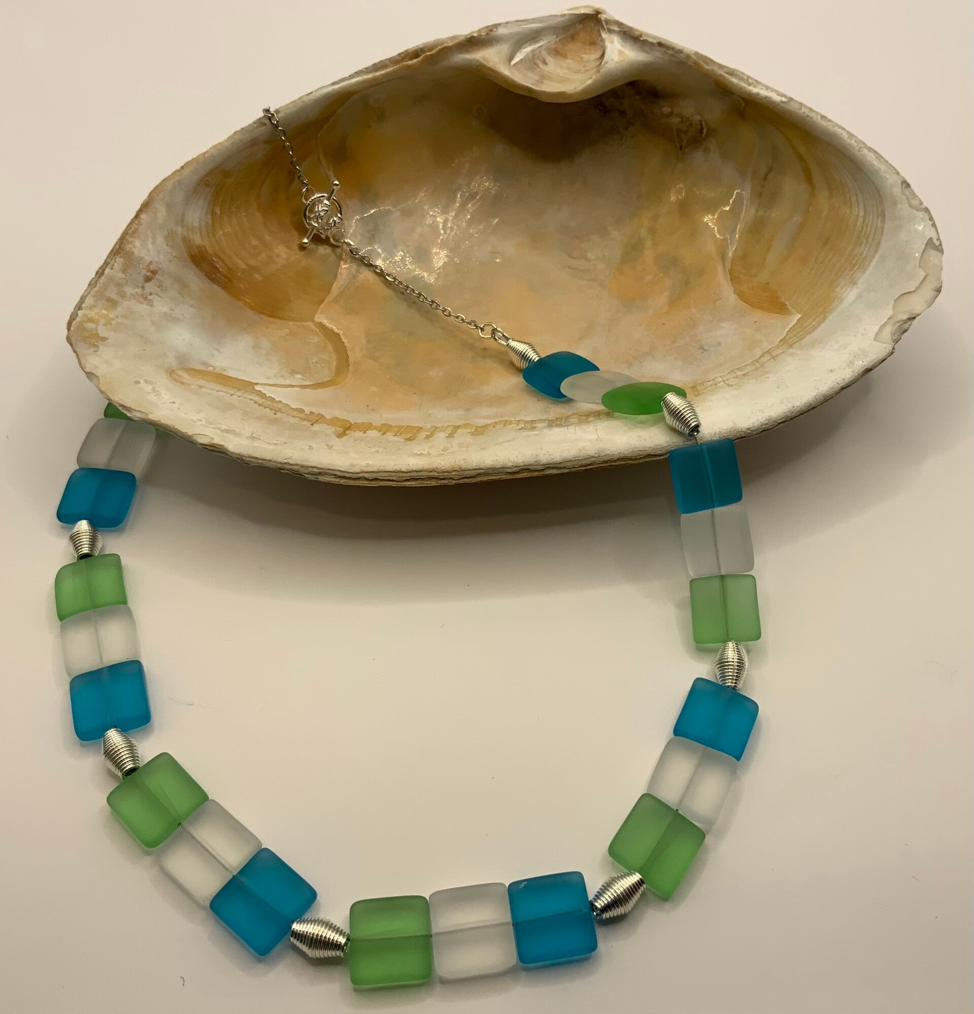 This beautiful Seaglass necklace evokes all things summer. Tri-colored with blue, green, and white Seaglass it is interspersed with silver metal spacers. This closes with a sterling silver floral toggle clasp.