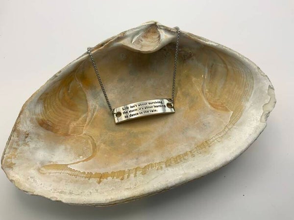 This is part of my new line of inspirational bracelets. Life isn't about surviving the storm, it's about learning to dance in the rain is featured on this slide bracelet that fits up to a size 8 wrist. This bracelet is 100% surgical stainless steel.