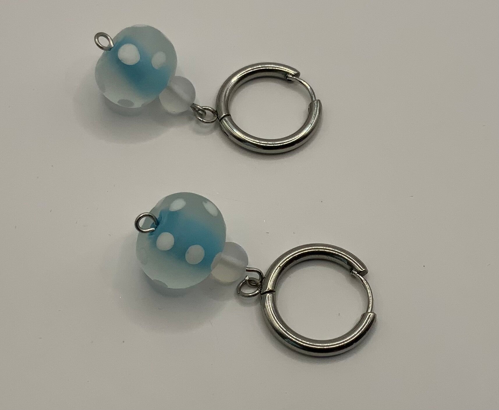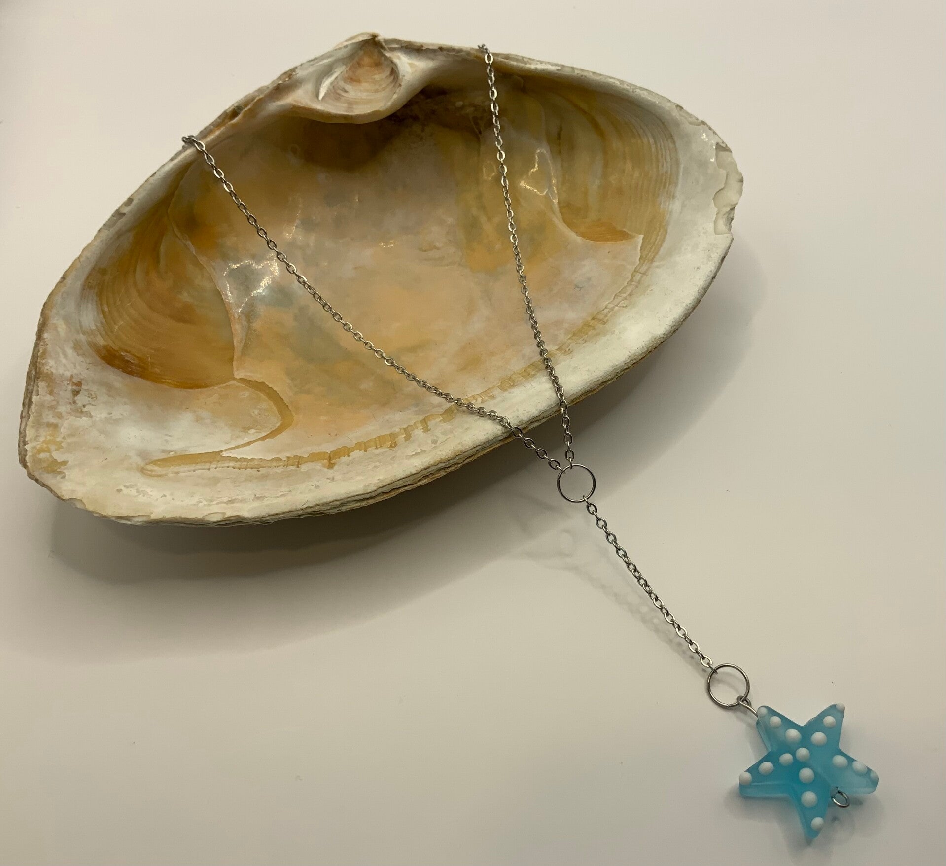 This adorable set will put you in that summer frame of mine. Both necklace and earring posts are all made from surgical stainless steel. The earring posts are leverback hoops which feature 2 glass beads. The main part of the necklace measures 20" of length while the pennant chain adds and additional 3 " for a total length of 23". The pennant is an adorable glass starfish which measures 1" in height and 1" in width.