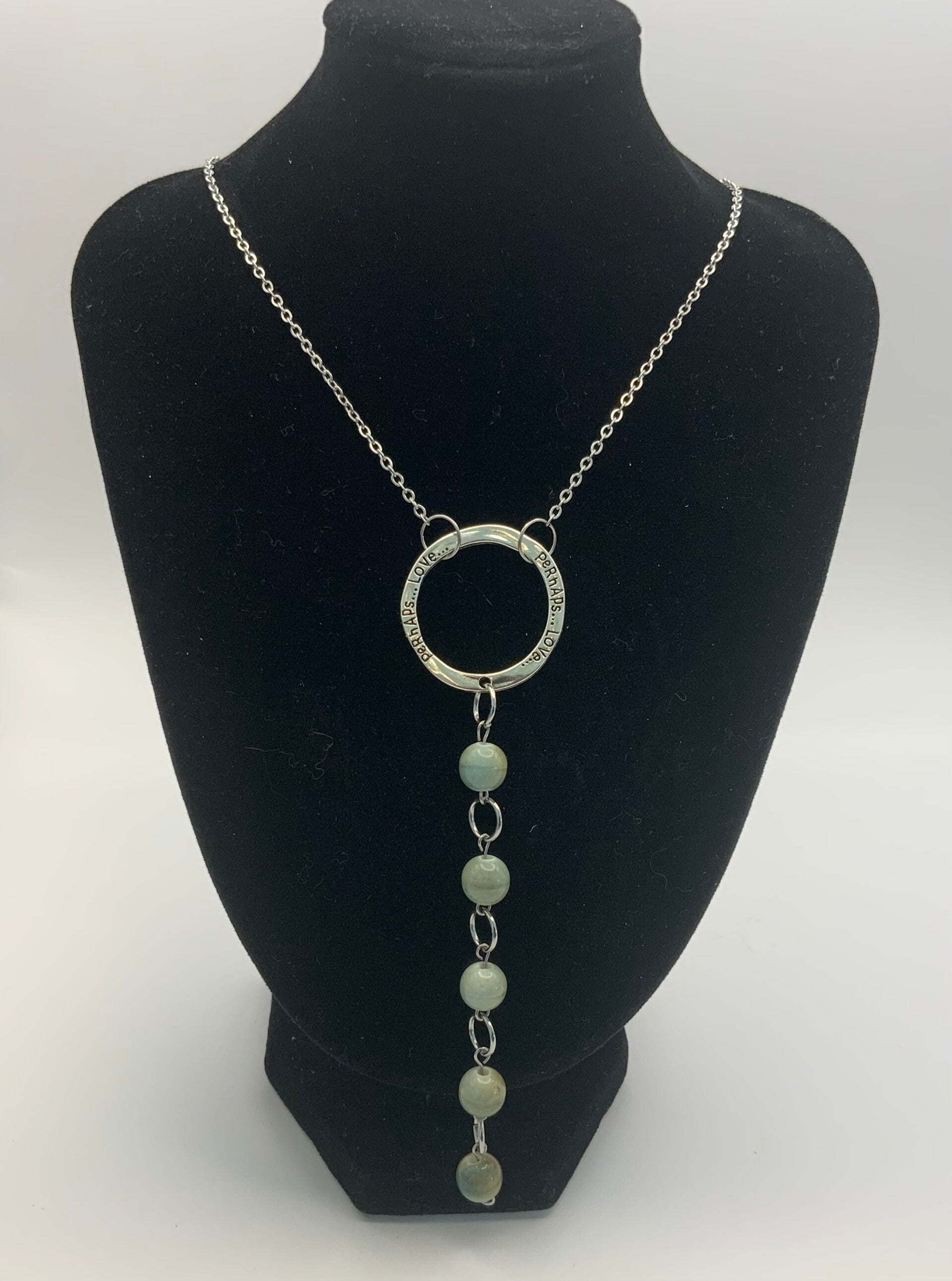 This simple but beautiful Necklace features a handmade dangling pennant featuring a lightly hammered circle that says Perhaps Love. Hanging from the circle are five sea colored ceramic beads. The necklace measures 17" but the pennant and hanging beads add the additional length. This chain and it's lobster claw closure are surgical stainless steel.
