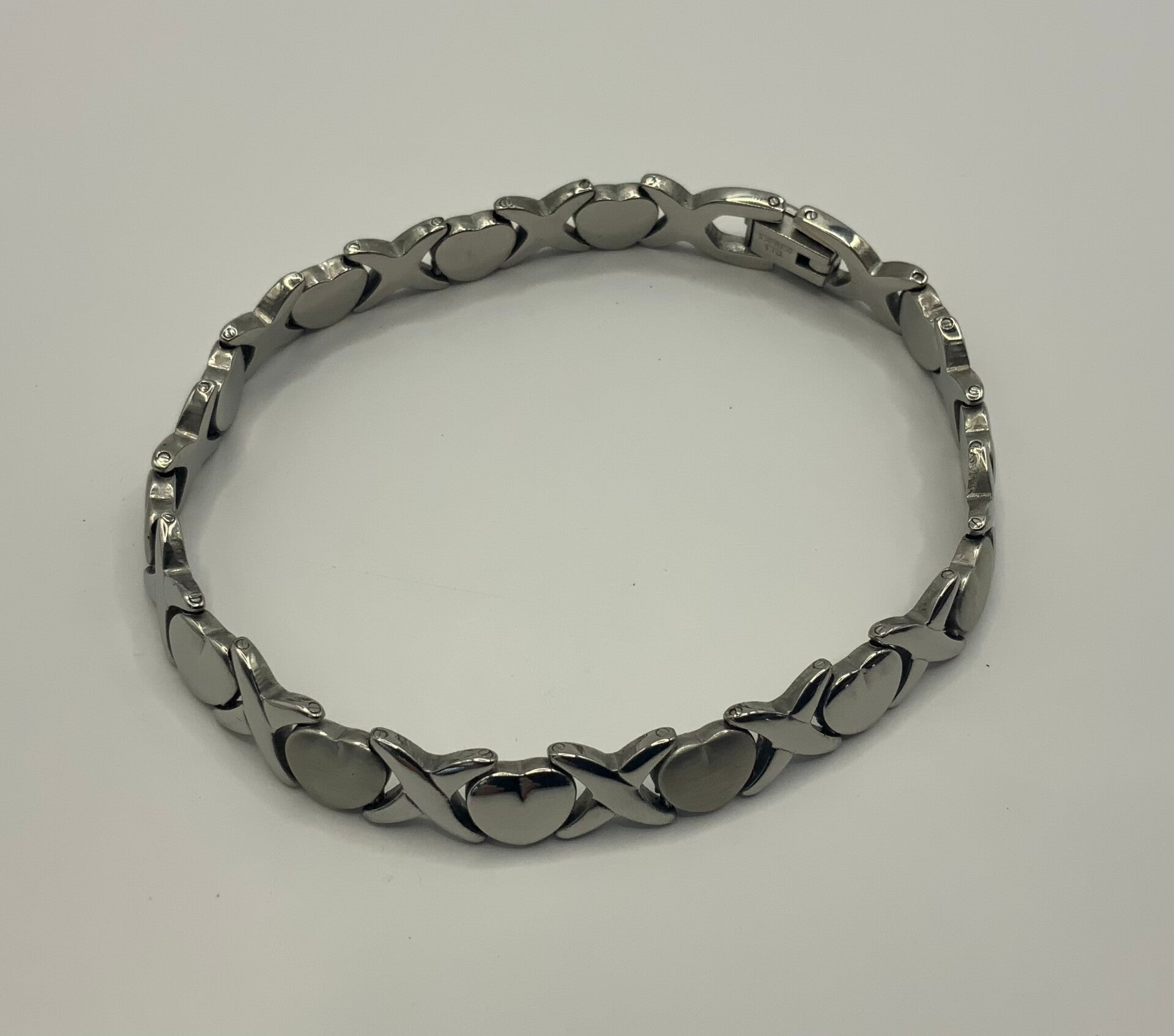 This 100% surgical stainless steel bracelet is something anyone would treasure. With alternating shiny and matte finish hearts representing the hugs symbol and shiny X's representing the kiss symbol this will look beautiful on your wrist. This would fit looser on a size 6 1/2" wrist and semi loose on a size 7 wrist. Wear it alone or pair it with other bracelets for a more modern look.