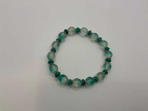 This bracelet features aqua colored beads highlighted by antique silver and tourquoise spacers. This bracelet goes perfect with the earrings and necklace also sold in this store.