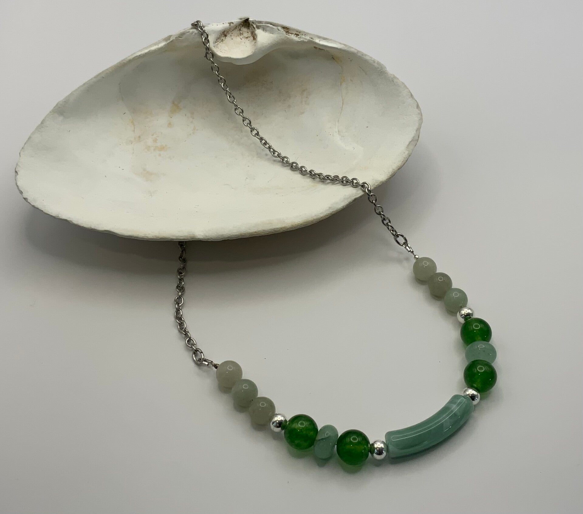 This natural jade and glass beaded necklace features a central sage and white tube bead highlighted with silver beads on either side. A darker green is brought in to make the necklace pop. This necklace is a surgical steel cable chain with a surgical steel lobster claw closure. This necklace measures 21" in length.